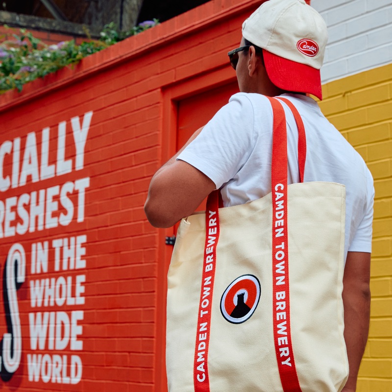 Our unisex off-white tote features screen printed red webbing handles, an embroidered Camden logo on one side. Crafted from durable 16oz cotton fabric, its built to carry your essentials (and a few beers).