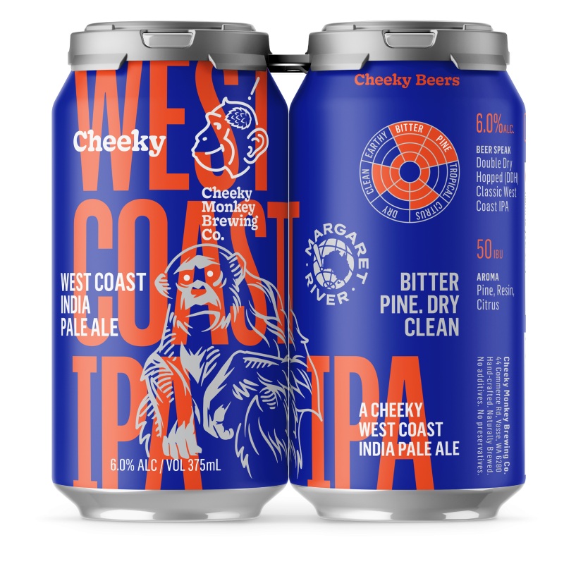 Cheeky Monkey Brewing Co West Coast IPA Classic West Coast IPA with a citrus, pine, and resinous aroma and a bitter pine, clean, dry taste. Double dry hopped with Amarillo and Simcoe Cryo hops. Style: Classic West Coast IPA, Double Dry Hopped (DDH) Malts:C