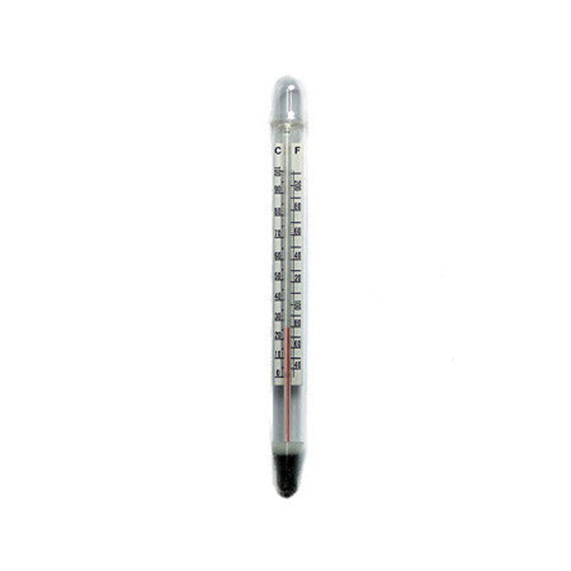 This standard thermometer features both Fahrenheit and Celsius scales. Temperature ranges from 0 to 220 degrees Fahrenheit. This thermometer floats so you can drop it right in your wort, mash, fermentor, etc to get more accurate readings. Glass does become