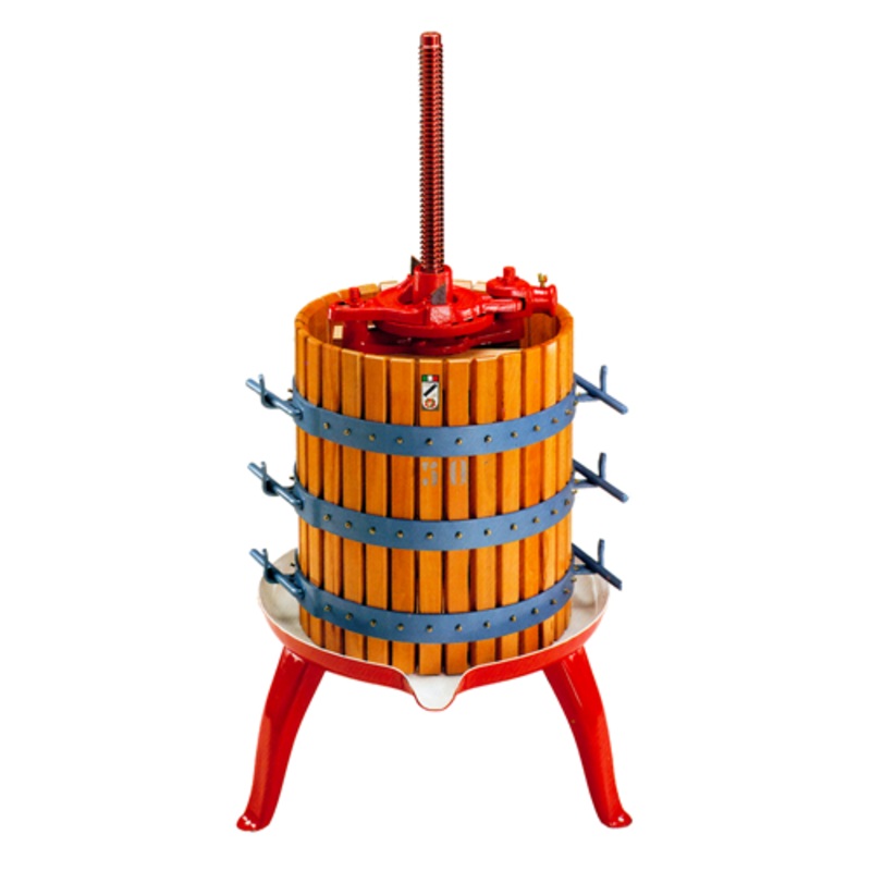 *NOTE:This is currently only available for in store pickup. This classic ratcheting style fruit press isaffordableand easy to use at home. Wood slats on the side with a painted base and stand. Basket size is 10" D x 14" H. 5 Gallon capacity. For use with s