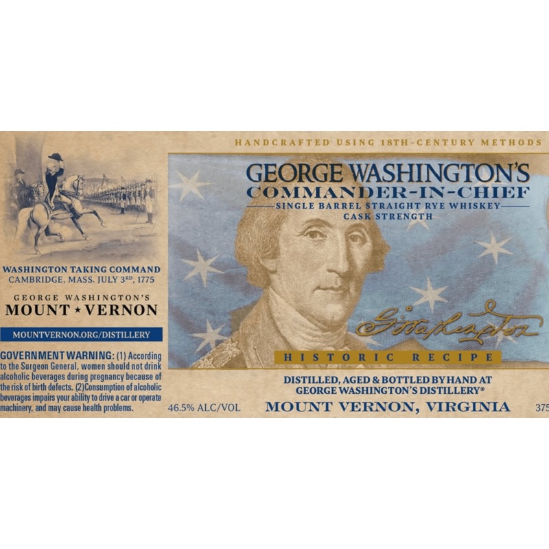 George Washingtons Commander-in-Chief Single Barrel Straight Rye Whiskey Cask Strength Handcrafted using 18th-century methods and distilled at the historic George Washingtons Distillery in Mount Vernon, Virginia, this exceptional rye whiskey pays tribute t