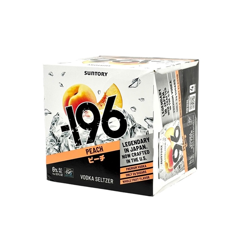 Suntory -196 RTD Peach Vodka Seltzer is like a juicy peach that went to a cocktail partysweet, bubbly, and just enough vodka to make you feel like youre at the VIP section of a fruit orchard. 5.5% ABV, 4 x355 ml cans -196, pronounced Minus One Nine Six, is