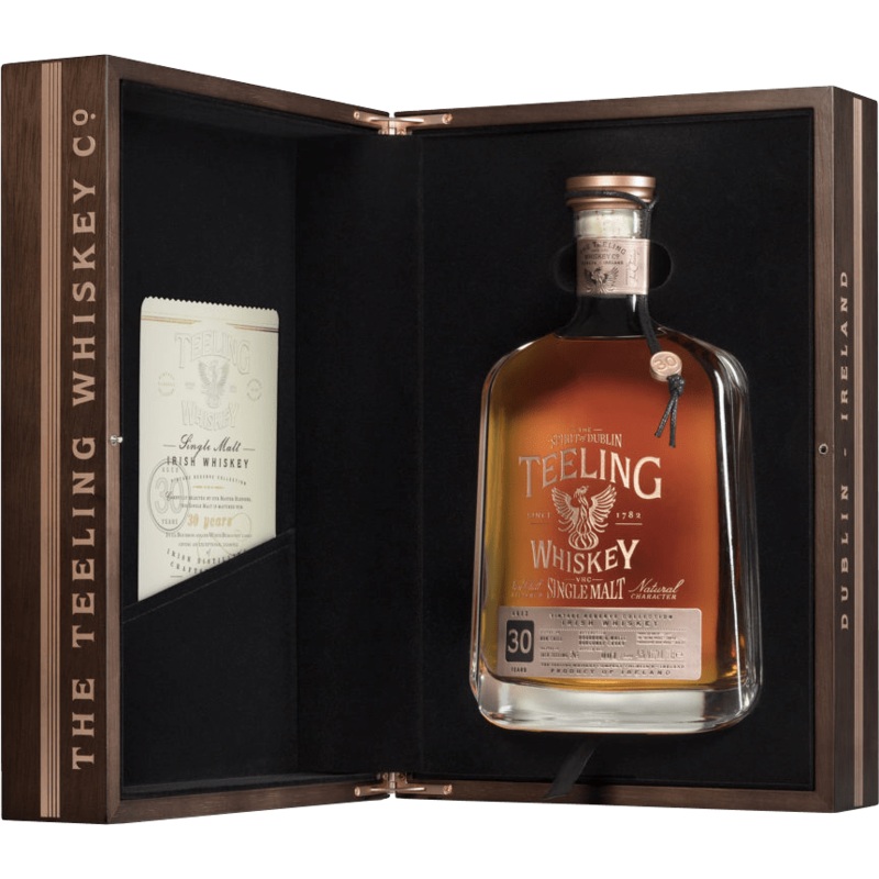 The Teeling 30 Year Old Vintage Reserve Single Malt is amongst the oldest Single Malt Irish Whiskeys ever released. Limited to just 500 bottles, this whiskey is drawn from a handfull of casks carefully selected by our Master Blender for their rich and flavoursome quality. Distilled in 1987 and initially matured in bourbon barrels, this whiskey is given extra maturation in French White Burgundy wine casks to add an extra layer of complexity. The result is a beautiful bouquet of tropical fruit flavours complimented by the deep layered malt and wood notes that linger on the finish. A rare coinage of true character, this is a whiskey to be savoured.