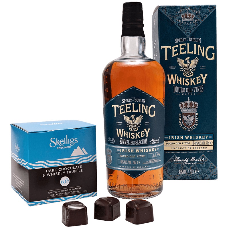 Part of Dublin distillery Teeling Sommelier Series, Douro Cask has been made using Portuguese ex-red wine casks which adds plum and spice to the floral and fruity notes of Teeling small batch whiskey. Here, it’s paired with fantastic chocolate whiskey truffles from Co Kerry’s Skelligs Chocolate. What’s included: one bottle of Teeling Sommelier Series Douro Cask Whiskey and one box Skelligs Chocolate Dark Chocolate & Whiskey Truffle in an elegant gift box.